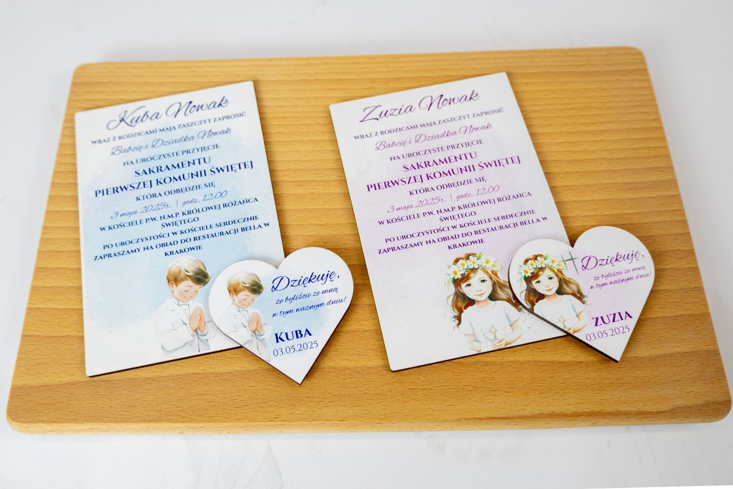 Poszukujesz oryginalnych podziękowań dla gości komunijnych, które zachwycą swoim urokiem? Nie mogłeś lepiej trafić! Podziękowania dla gości wykonane z wysokiej jakości, lakierowanej płyty HDF, wraz z personalizowanym nadrukiem to nowość na rynku komunijnym!