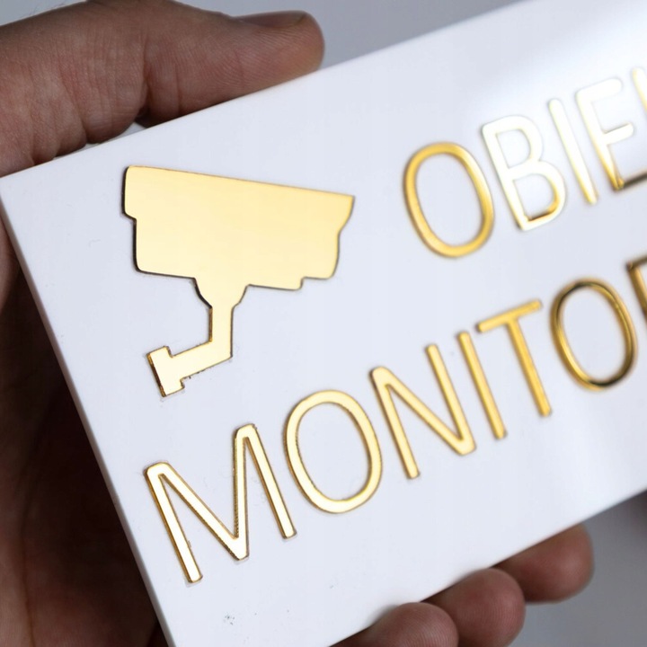 Elegancka tabliczka obiekt monitorowany wykonana z białego szkła akrylowego (plexi) z efektownym złotym lustrem. Styl glamour, trwałość i widoczność – idealna do biura, lokalu i przestrzeni publicznych. Polski produkt, ręcznie wykonany.